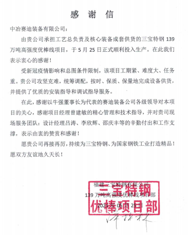 5月25日,賽迪裝備收到福建三寶特鋼有限公司發來的感謝信,信中對賽迪裝備牛強董事長為代表的各級領導,項目經理曾建敏,設計經理呂濤、李欣輝、邵慶豐等的辛勤付出和工作支撐,表示由衷的贊賞和感謝,對賽迪裝備的技術能力、產品質量和團隊精神給予高度認可與肯定。