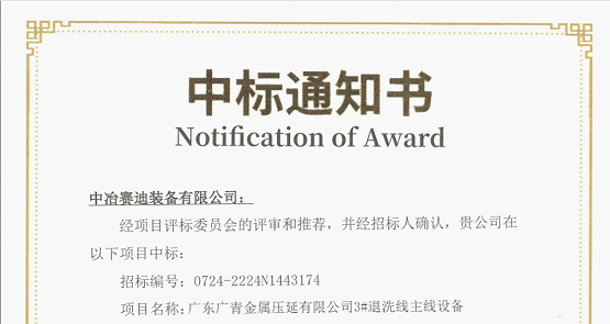 7月25日,中冶賽迪裝備接到廣青金屬壓延有限公司中標(biāo)通知書(shū),由賽迪股份、賽迪裝備共同開(kāi)拓的廣東廣青金屬壓延3#不銹鋼退火酸洗主線設(shè)備成套項(xiàng)目成功中標(biāo)。