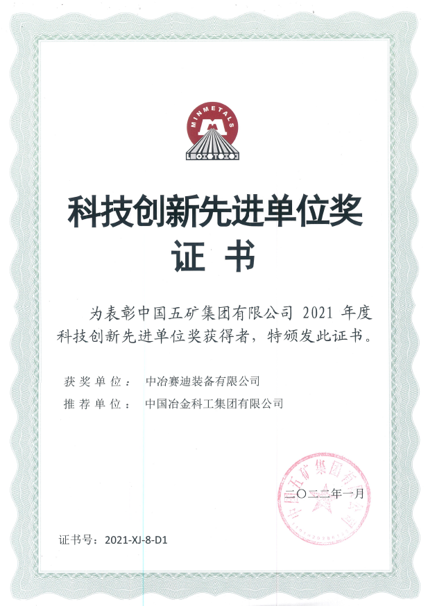 在近期召開的中國五礦集團(tuán)科技創(chuàng)新大會上,五礦集團(tuán)對為集團(tuán)公司創(chuàng)新發(fā)展做出突出貢獻(xiàn)的集團(tuán)和個人進(jìn)行了表彰,并授予賽迪裝備“2021年度五礦集團(tuán)科技創(chuàng)新先進(jìn)單位”稱號。