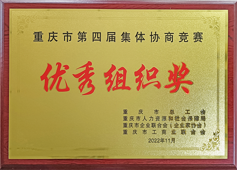 重慶市第四屆集體協商競賽于11月7日至8日在江北世紀金源大飯店舉行,來自各區縣總工會、市級產業工會的46支代表隊參賽。公司人力資源部副部長張昆作為江津區總工會代表隊的首席代表,聯合其他3位協商代表,為江津區總工會贏得了“優秀組織獎”榮譽,張昆個人獲得重慶市 “優秀協商員”榮譽稱號。