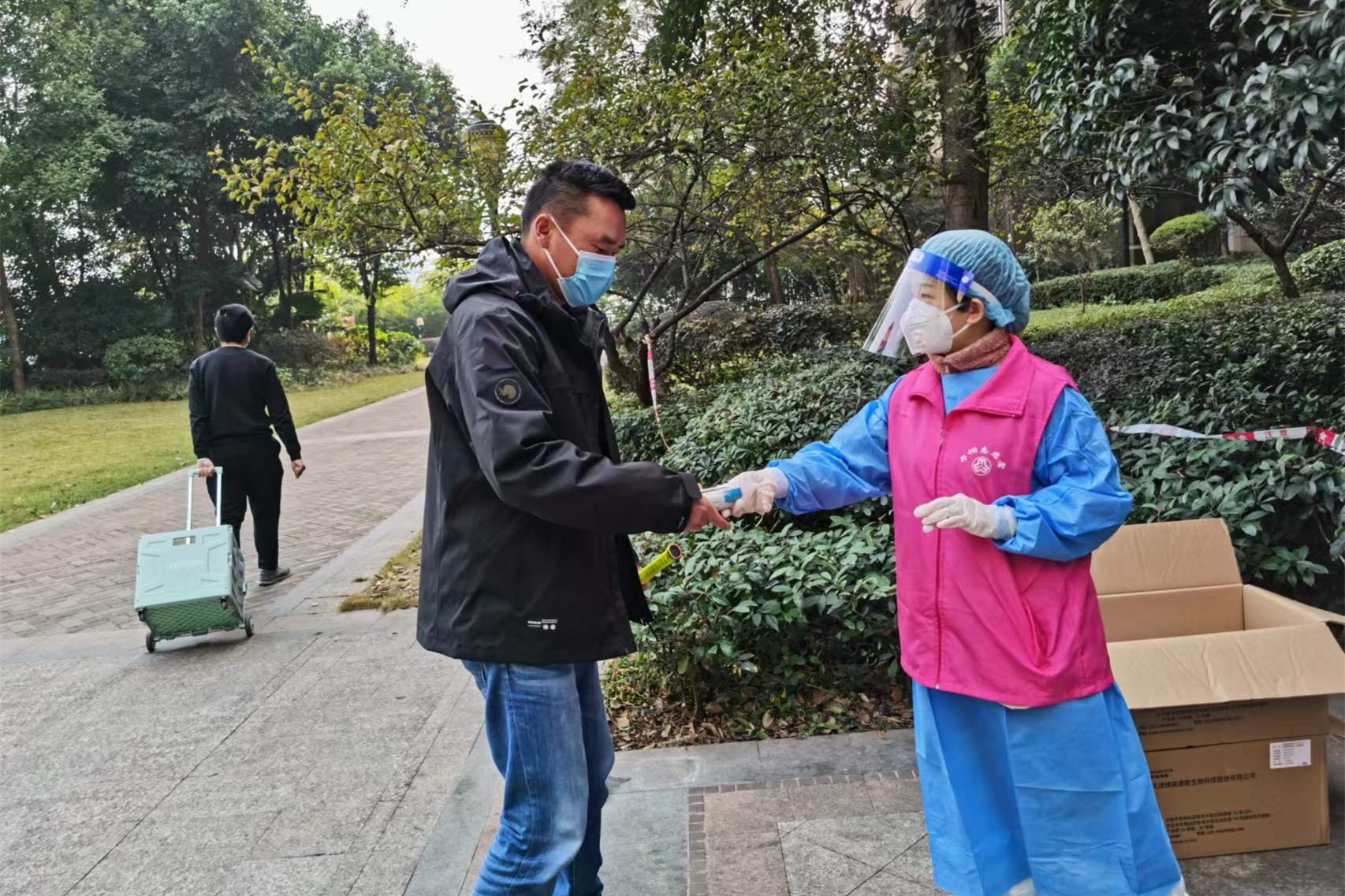 “我是黨員,我必須要上。”居家第一天,銷售中心的李淑娟便主動加入到渝中區雙鋼路社區志愿服務隊。之后每一天,處理好工作,為在家上網課的女兒做好一天的飯菜后,李淑娟就穿上防護服,戴上手套和護目鏡奔赴社區核酸檢測點。她主要的工作任務是維持秩序、擔任核酸檢測錄入員,十余天里,李淑娟累計協助醫護人員完成了數千人的掃碼工作。