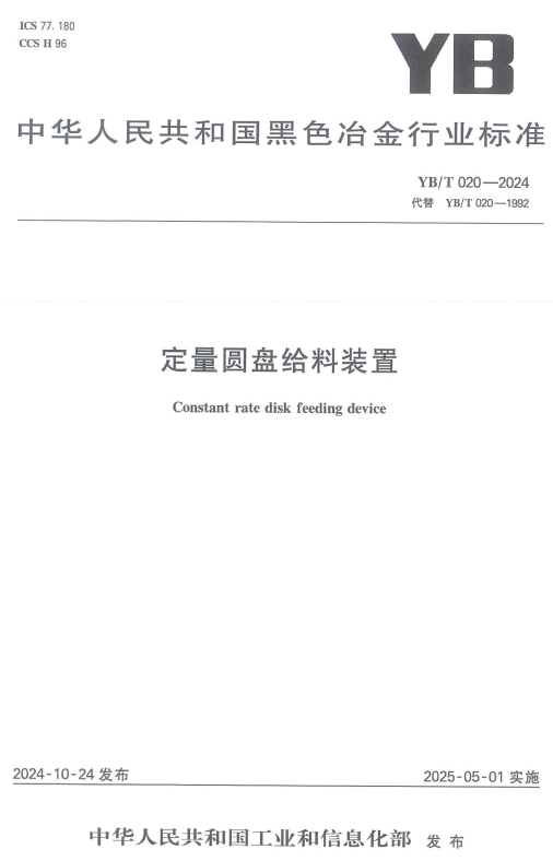 公司主導修訂的《YB/T 020-2024 定量圓盤給料裝置》行業標準正式發布